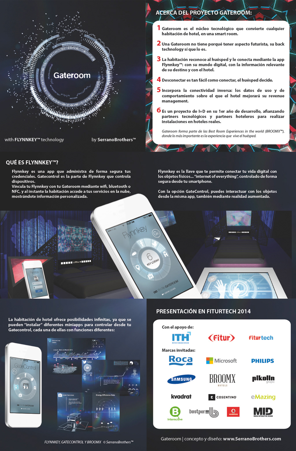Gateroom™ es un proyecto de SerranoBrothers™ que se presentó en Fiturtech 2014 (Madrid), con el apoyo de Instituto Tecnológico Hotelero y Fitur. Gateroom™ es el núcleo tecnológico que convierte cualquier habitación de hotel en una smart room. La habitación reconoce al huésped y le conecta mediante la app Flynnkey™ con su mundo digital, con la información relevante de su destino y con el hotel. Equipo creativo y de desarrollo: SerranoBrothers, Alex Posada, Xavi Vinaixa, Sergi Lario, David Dalmazzo.